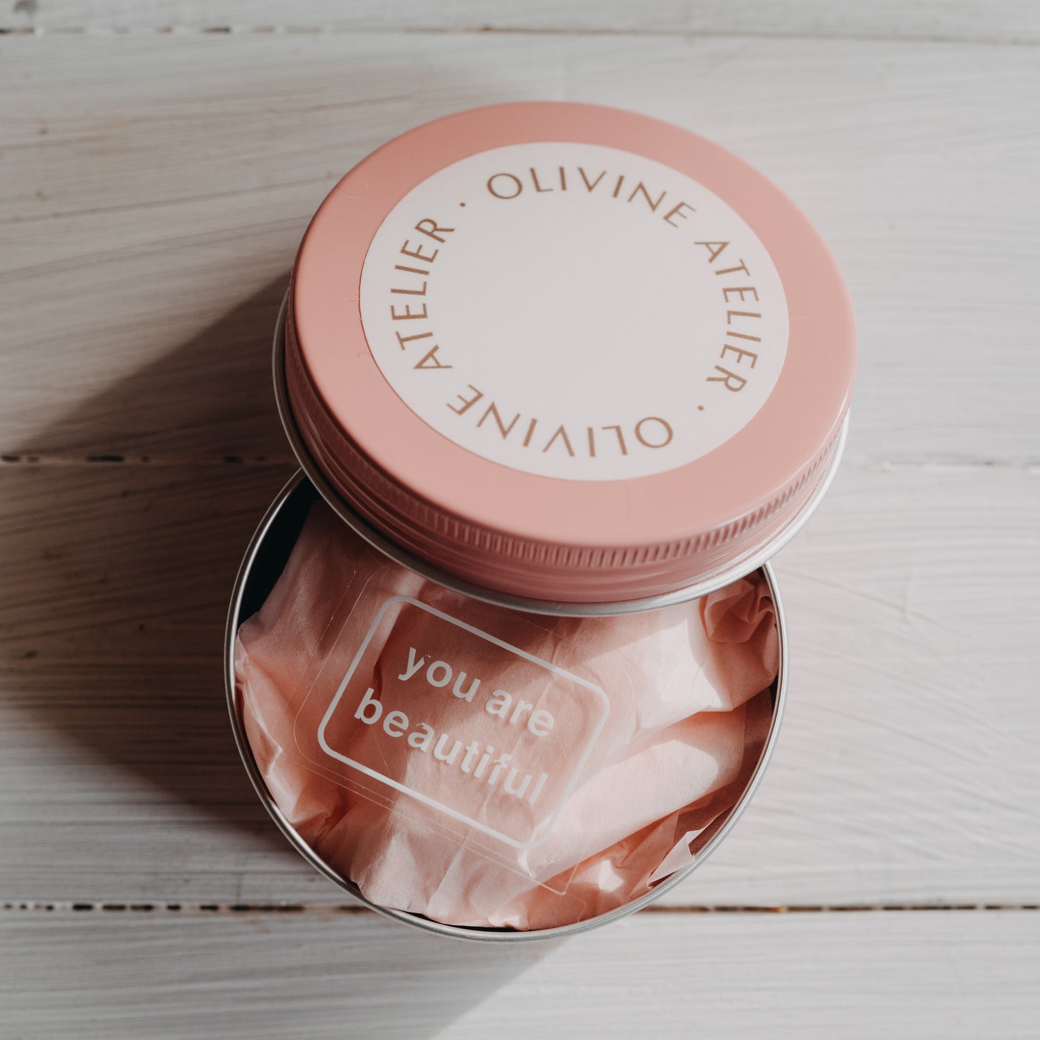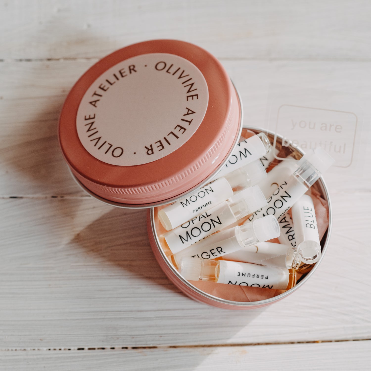 Nestled into a candy pink tin you will find - The full collection of all 12 perfumes from the Olivine Moon series in 0.5 ml glass sample vials. It’s the best way to find your next signature scent, or layer your rituals with intention.