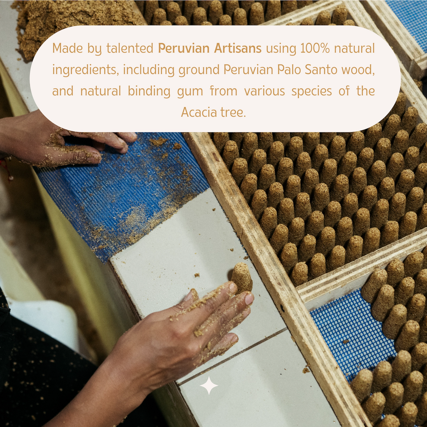 Each cone is handmade by skilled artisans in Peru using 100 percent natural ingredients, including high-resin Peruvian palo santo wood and a natural acacia tree gum that acts as the binder. The result is a deeply aromatic cone that burns smoothly and evenly.